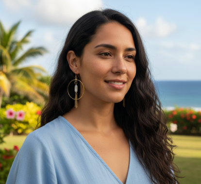 El material de la prenda es una aleación de alta calidad. Su diseño es un aro circular dorado con pieza central de madre perla rectangular y delicadas cadenas colgantes. La piedra es Madre perla natural con acabado pulido. Su cierre es un gancho largo para colocación rápida y cómoda.