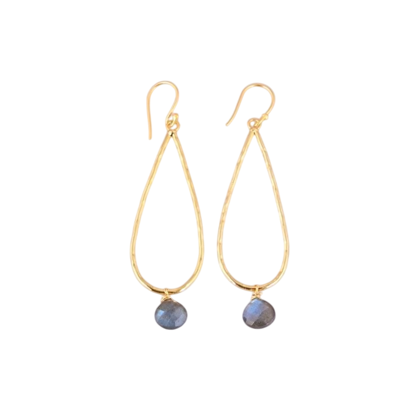 Estos aretes presentan un diseño en forma de lágrima estilizada en baño de oro con textura martillada, acompañado de una piedra natural de labradorita facetada que cuelga en la parte inferior. La labradorita es reconocida por sus destellos iridiscentes que cambian con la luz, lo que aporta un toque elegante y místico. Son ligeros, cómodos de llevar y combinan fácilmente con atuendos tanto casuales como de ocasión especial.